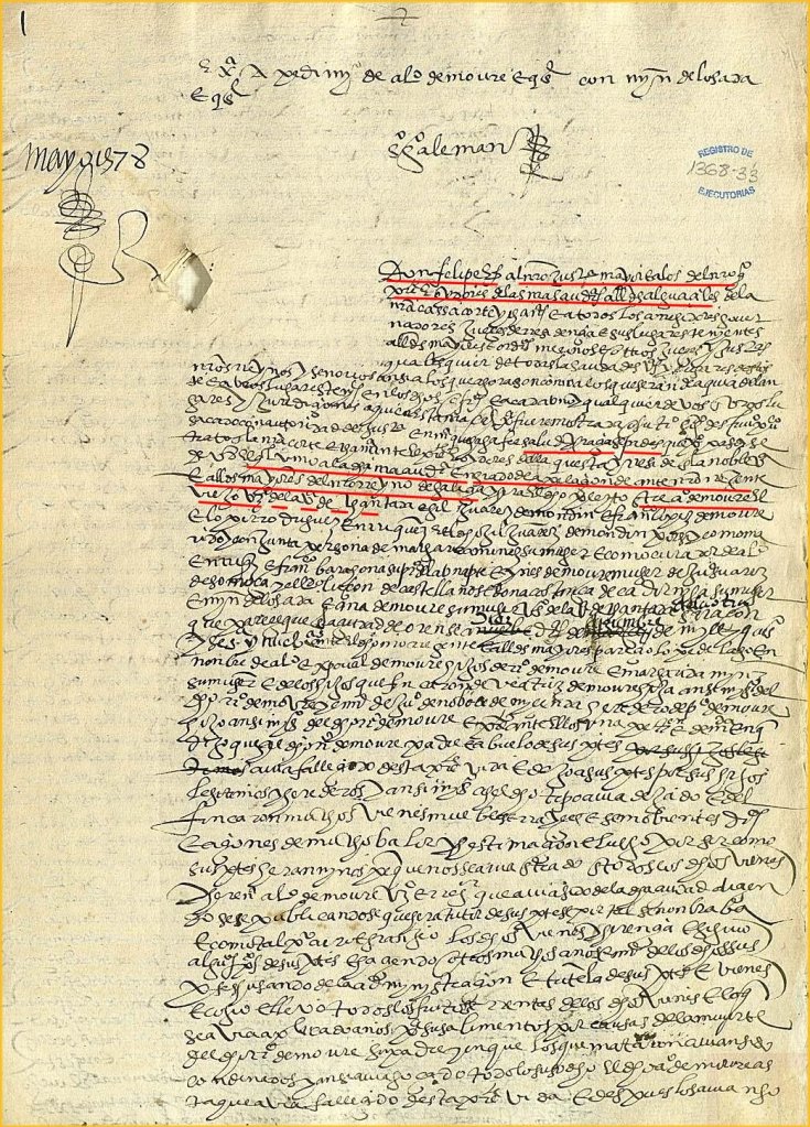 2.- Don Felipe etc al nuestro justiçia mayor e a los del nuestro consejo presidente y oydores de las nuestras audiencias alcaldes e alguaciles de la nuestra cassa corte y chancillerías e a todos los corregidores governadores jueçes de rresidençia E sus lugares tenyentes alcaldes mayores e ordinarios merinos e otros jueces y justiçias cualquier de todas las ciudades villas y lugares destos nuestros rreynos y señoríos contra los que agora son como a los que serán de aquí adelante e a vuestros lugartenientes en los dichos oficios e a cada uno y cualquier de vos en vuestros lugares y jurisdiçión es a quien esta nuestra carta executoria fuere mostrada o su traslado de escribano público sacado con autoridad de fuerza en manera que haga fee salud y graçia. Sepades que tiempo pasado se trató en la nuestra corte e chancilleria ante el presidente y oydores della questá y rreside en al noble villa de Valladolid el qual vino a la nuestra Audiencia en grado de apelación de ante nuestro regente e aldaldes mayores del nuestro Reyno de Galicia y hera el dicho pleito entre Alonso de Moure el Viejo vezino de la villa de Chantada e Gil Suarez de Mondín e Francisco Lopez de Moure e Lope Rodriguez Enriquez e el dicho Juan Suarez de Mondín por si y como marido y conjunta persona de Margarita Nuñez su mujer e como curador de Alonso Enriquez e Francisco Barahona su procurador de la una parte // e Ynés de Moure mujer de Juan Suarez de Somoça y el licenciado Luçon de Castellanos e doña Constança de Cadórniga su mujer e Martin de Losada e Ana de Moure su mujer vezinos de la villa de Chantada de otra es rraçon que paresçe que en la ciudad De Orense a diez días del mes de diciembre de mil y quinientos y sesenta y nueve ante el dicho nuestro regente e alcaldes mayores pareçio Lope de Lago en nombre de Alonso e Cristobal de Moure hijos de Rodrigo de Moure e Margarita Nuñez su mujer de los hijos que fincaron de Beatriz de Moure hija ansímismo del dicho Rodrigo de Moure y en nombre de Juan de Noboa … heredero de Pedro de Moure hijo ansímismo de dicho Rodrigo de Moure e presentó ante ellos una petición e demanda en que dijo que el dicho Rodrigo de Moure padre e abuelo de sus partes avía fallecido desta presente vida e dejó a sus partes por sus hijos legítimos y herederos y ansímismo a hel dicho tiempo avía dejado e del fincaron muchos bienes muebles e rrayzes e semovientes dineros e açiones de mucho valor e hestimación e luego por ser como sus partes heran niños pequeños se avía entrado en todos los dichos bienes y herencia Alonso de Moure vezino e rregidor que avía sido de la dcha ciudad diciendose e publicándose que hera tutor de sus partes e por tal se nombraba E como tal pareçio e grangeo los dichos bienes y herencia e siguio algunos pleitos de sus partes e haçiendo otros muchos daños E de los dichos sus partes husando de la administración e tutela de sus partes e bienes e cogio e llevo todos los frutos e rrentas de los dhcos bienes e lo que se avía aplicado años para sus alimentos por causas de la muerte del dicho Rodrigo de Moure su padre y en que los que mataron avían sido condenados y ansí avía goçado todo lo susudcho el dicho Alonso de Moure hasta que avía fallecido desta presente vida e después los avían go