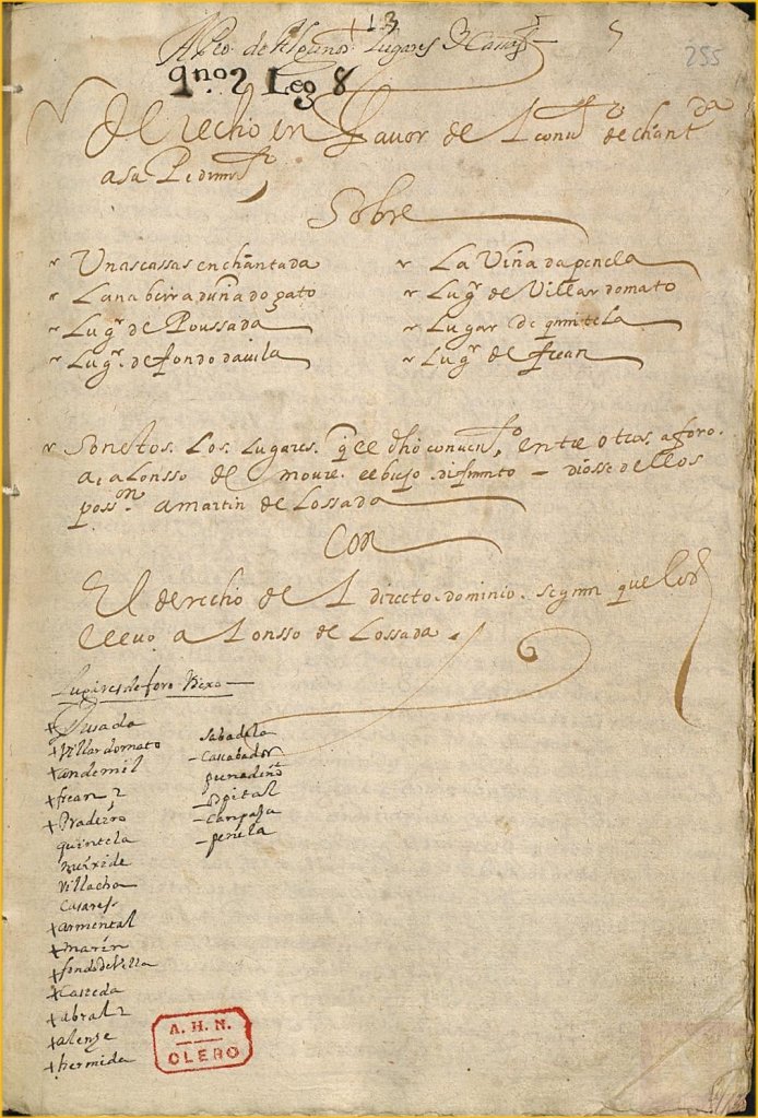 Queda en el documento delimitado dicho dominio y reconocido como propio del monasterio de Chantada, ya que «…juran que dho lugar y lo ael perteneciente ques drto Srío de dho mº de san salvador de chantda…» (…juran que dicho lugar y lo a el perteneciente que es directo señorío del monasterio de San Salvador de Chantada), como era el verdadero objetivo del apeo.