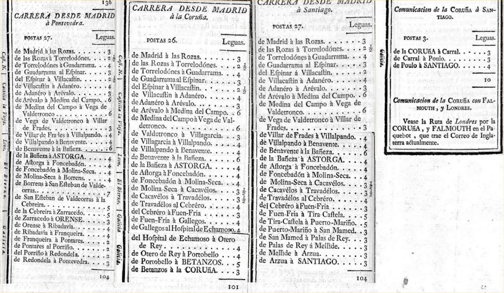 Los primeros mapas con los itinerarios de postas aparecieron publicados en el siglo XVII pero se fue ampliando a lo largo del siglo XVIII. En el mapa de España de Jaillot de 1721 se explica en la leyenda que son «exactamente recogidas y observadas todas las rutas de postas de España, basadas en los informes de los Correos Mayores de Madrid. Por orden de su excelencia el marqués de Grimaldo, ministro y secretario de estado de su majestad católica»: