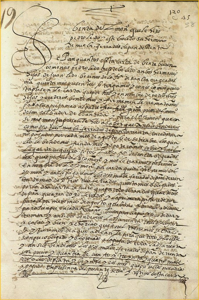 Sepan quantos esta carta de venta vieren como nos pedro ledo y estebo ledo ambos hermanos hijos de juan ledo vecinos de la frª de sancta ougea dasma questasmos presentes y otorgamos y conosçemos por esta presente carta que por nos y en nombre de todos nuestros hijos y erederos vendemos y firmemente rrematamos para siempre jamás al padre frai franco. giron prior del monº de san salvador de chantada y para el dicho monº que ansi mismo esta presente hes a saber que ansi le vendemos como dicho hes nueve ferrados de pan de rrenta en cada un año pagados por cada mes de agosto o de setiembre los quales le vendemos fundamos y opotecamos sobre y en el lugar da cuqueira sito en la dicha frª de Sancta Ougea dasma ques propio del dicho monº y y ansi le pagaremos los dichos nueve ferrados de pan de rrenta de mas de otros tres ferrados questamos obligados por la dicha carta de fuero que por todo serán dos quarteros de pan que azen doze ferrados y la primera paga a de ser para el primero mes de agosto que viene y de allí adelante para siempre en cada un año. buen pan linpio y seco de dar y tomar y ansi bos bendemos la dicha renta en el dicho lugar y casal y bien qe el herial que en el tenemosnque halque yzieremos de aquí adelante para que todo hello este siempre obligado y opotecado a la paga de toda la dicha rrenta por precio y quantia de ciento y treinta y nueve rreales de plata y beynte y dos maravedies que por ellos nos adado y pagado enpresencia del presente escribano y testigos desta carta