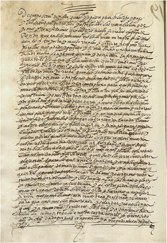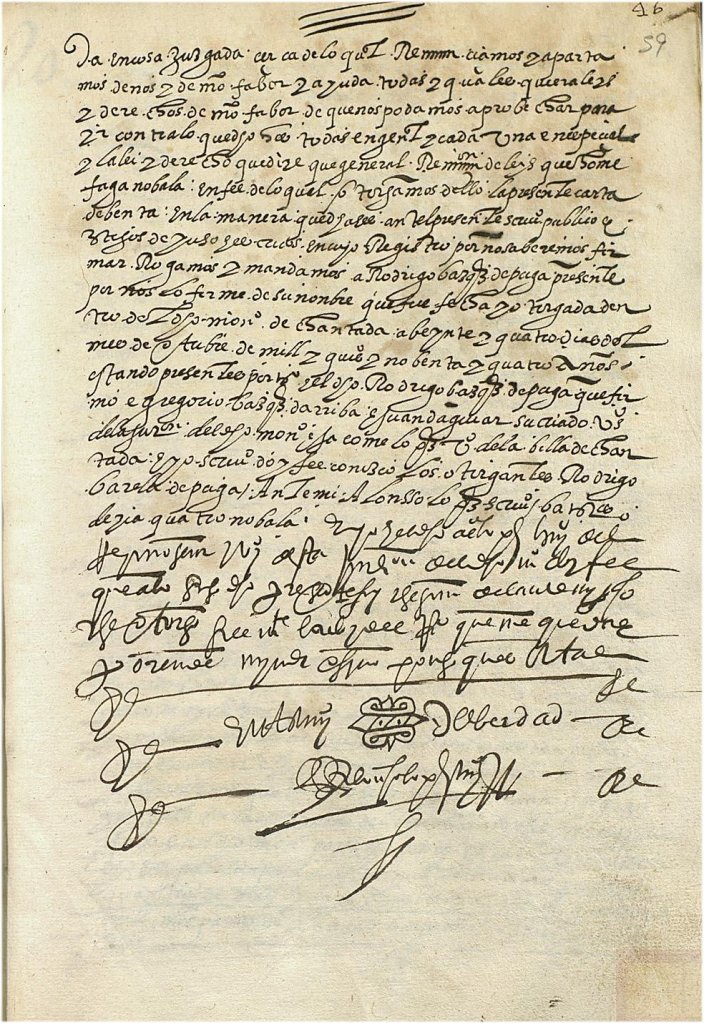 de que yo escribano doy fee quel dicho padre prior se los dyo y pago y los sobredichos pedro ledo y estebo ledo los rresçibieron y dezimos y cooonfesamos que los dichos nueve ferrados de pan de Renta que andi brnfrmos no bale mas ni tanto de los dichos ciento treinta y nueve rreales y veinte y dos maravedíes que de la demasía le aremos gracia y donacion en forma y por quanto el dicho lugar y bienes sobre que le vendemos ques propio del dicho monº y sobre desto rrenunciamos la ley del hordenamiento rreal que abla sobre las cosas que se compran o venden por mas o por menos de la mitad del justo precio y le damos poder conplido y en causa propia para que se pueda tomar la posesión del dicho lugar y Rentas por su autoridad y justicia y entretanto nos constituymos por sus ynquelinos y plecareos poseedores y nos obligamos con nuestras personas y bienes abidos y por aber de man común y cada uno de nos por si y por el todo y Renunciamiento la autentica presente juicio y ltade fideyusoibus de pagar la rrenta en cada un año y al dicho año y plazo y que será cierta y sana y segura y pagada en cada un año al dicho monº y que ahella no le será movido pleito y se alguno le fuere movido lo seguiremos a nuestra costa asta que le sea todo hello cierto y sano y seguro so pena devolver al dicho monº los dichos maravedíes con el doblo con todas las costas daños intereses que sobre dello se rrescibieren al dicho monº y para lo ansi tener y guardar y conplir y pagar nos obligamos de man común segun dicho hes y a nuestros herederos y por esta presente carta damos y otorgamos todo nuestro poder conplido y bastante a las justicias seglares de nuestro fuero y jurdiçion y al corregidor realengo mas cercano donde bebimos y Resedieremos a cuya jurdicion nos sometemos con nuestras personas y bienes para que ansi nos lo agann tener y guardar y conplir y pagar y a nuestros herederos bien ansi y a tan completamente como si todo lo en esta carta considerando hobiera sido escritura de sentencia dada por juez competente y a nuestro pedimento pasa